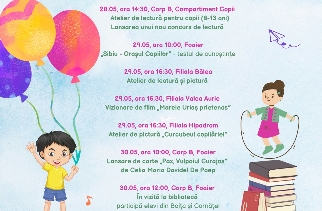 - În 29 mai, la ora 10:00, elevii participanți în proiectul „Sibiu, orașul copiilor” au o nouă întâlnire cu istoria orașului, de această dată demonstrându-și cunoștințele acumulate în cadrul testului de cunoștințe. În aceeași zi, de la ora 16:30, copiii sunt așteptați și în filialele bibliotecii – Bâlea, Hipodrom și Valea Aurie, la activități creativ-educative.
