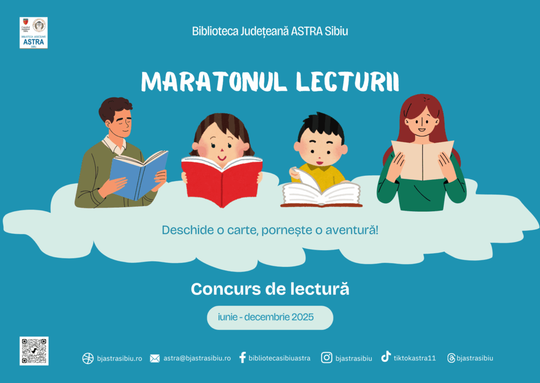 Biblioteca Județeană ASTRA Sibiu, instituție care beneficiază de susținerea financiară a Consiliului Județean Sibiu, lansează un nou concurs dedicat pasionaților de lectură. „Maratonul Lecturii 2025” se va desfășura în perioada iunie – decembrie 2025, adresându-se participanților în cadrul mai multor categorii de vârstă: Copii (8-10 ani și 11-13 ani), Adolescenți (14-18 ani) și Adulți (peste 18 ani). Înscrierea și participarea la concurs sunt gratuite, fiind necesar doar un permis valid de utilizator al Bibliotecii ASTRA Sibiu.