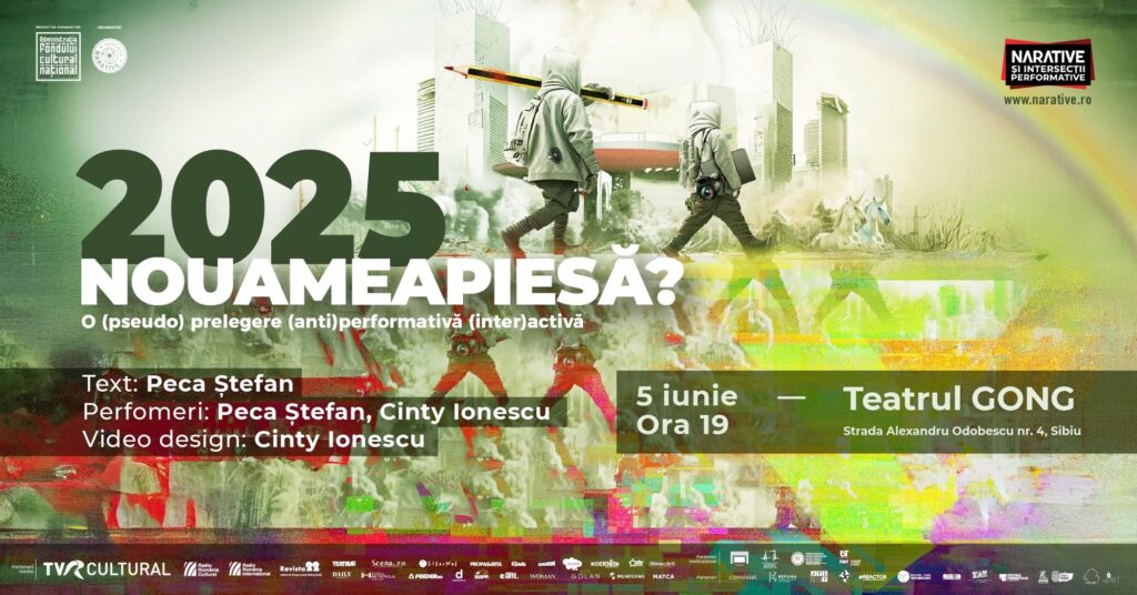 Teatrul pentru Copii și Tineret „Gong” Sibiu prezintă spectacolul – invitat „2025: Nouameapiesă?” pe un text semnat de dramaturgul Peca Ștefan, produs de Asociația Narative, în cadrul proiectului „Narative și intersecții performative”, co-finanțat de Administrația Fondului Cultural Național. Intrarea publicului este gratuită, în limita locurilor disponibile. Evenimentul va avea loc joi, 5 iunie, de la ora 19:00 și are o durată de aproximativ două ore, fiind recomandat celor cu vârsta peste 16 ani.