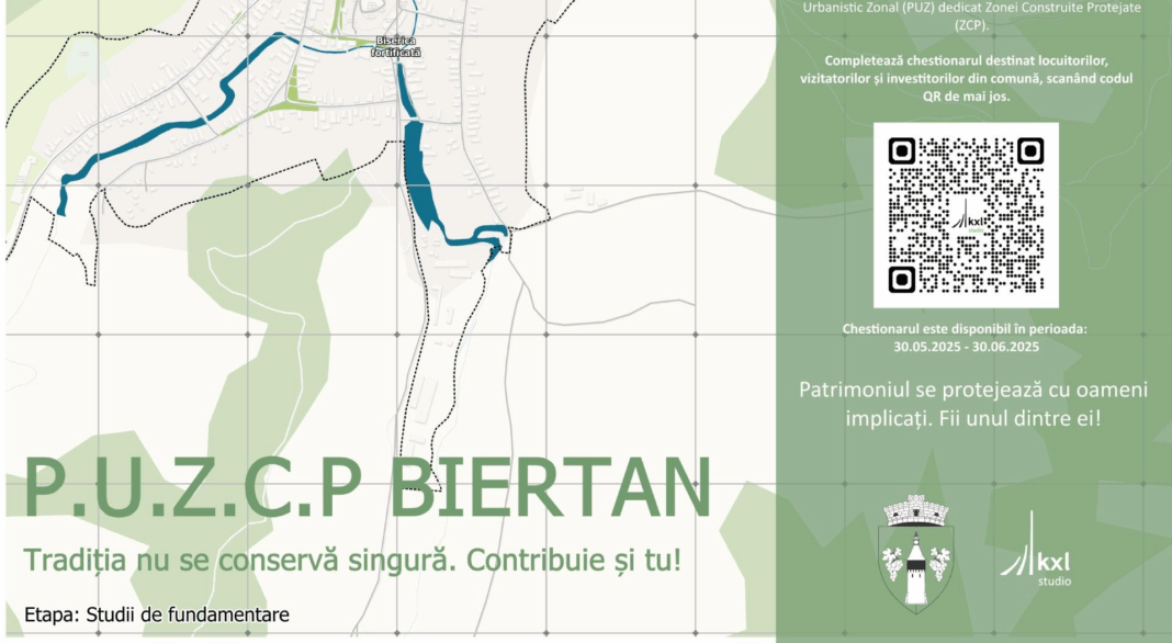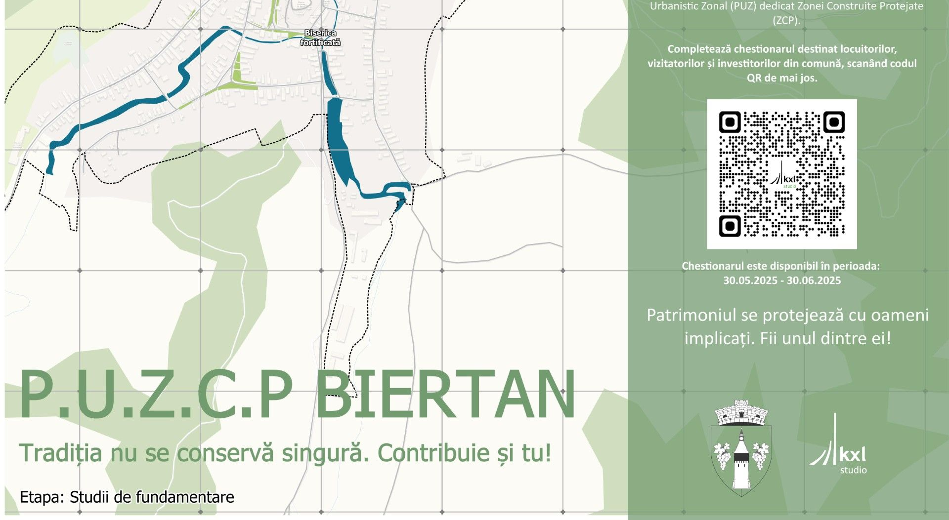 Primăria comunei Biertan anunță demararea elaborării documentației de urbanism pentru un Plan Urbanistic Zonal dedicat Zonei Construite Protejate (PUZCP), ce include și Situl UNESCO din localitate. Inițiativa se află în etapa de studii de fundamentare, iar administrația locală încurajează implicarea activă a cetățenilor prin completarea unui chestionar online, disponibil până în data de 30 iunie 2025. Scopul consultării publice este de a contura o dezvoltare urbană sustenabilă, care să valorifice patrimoniul istoric și să răspundă nevoilor comunității.