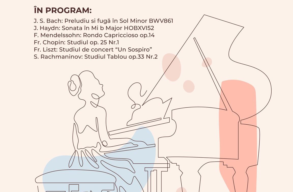 În programul recitalului puteți audia: J. S. Bach: preludiu și fugă în sol minor BWV 861, J. Haydn: Sonata în Mib Major Hob. XVI/52, F. Mendelssohn- Bartholdy: Rondo capriccioso op.14, Fr. Chopin: Studiul op.25 nr.1, Fr. Liszt: Studiul de concert „Un sospiro”, S. Rachmaninov: studiul tablou op.33 nr.2