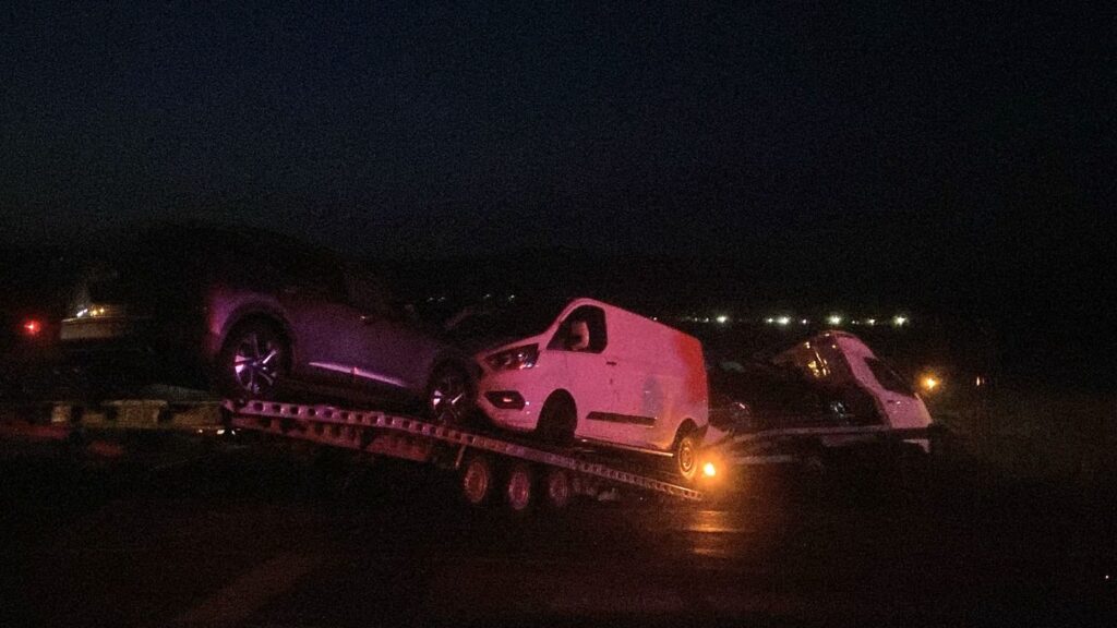 Conform primelor informații, cel puțin un autoturism și un ansamblu rutier care transporta mai multe mașini pe platformă au fost implicate într-o coliziune violentă.
