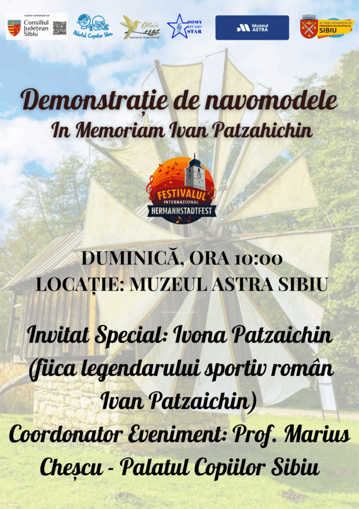 Muzeul ASTRA anunță un moment special în cadrul Festivalului HermannstadtFest 2025, unde este partener oficial. Duminică, 15 iunie, de la ora 10:00, vizitatorii sunt invitați pe lacul din Dumbrava Sibiului, în Muzeul în aer liber, la o demonstrație inedită de navomodele radiocomandate, organizată în memoria marelui sportiv Ivan Patzaichin.