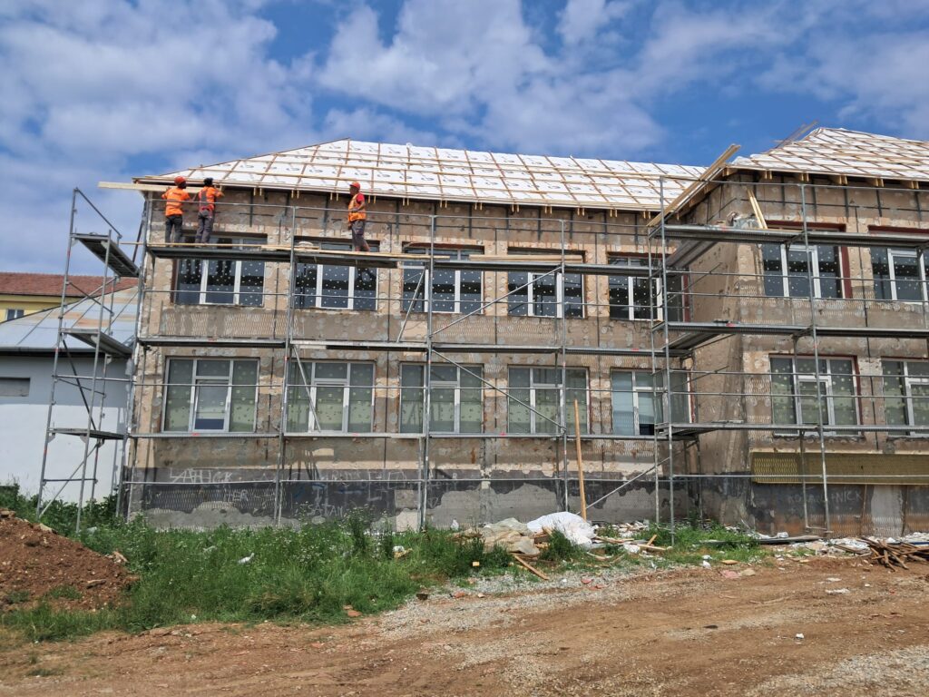 Ordinul de începere a lucrărilor a fost emis către constructorul Terusa Build SRL & Horizont Project 2D SRL în 31 martie anul acesta, iar până în prezent s-a realizat sistemul de drenaj din jurul clădirii, s-au desfăcut straturile de umplutură ale podului și învelitoarea de țigle pe o latură a imobilului, lucrându-se în prezent la consolidarea șarpantei pentru a putea fi montate panourile fotovoltaice. Pe aceeași latură a clădirii s-a început lucrul și la sistemul de termoizolație și la compartimentările interioare.