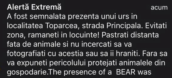 În urmă cu puțin timp, pe numărul unic pentru apeluri de urgență 112, a fost semnalată prezența unui urs în localitatea Topârcea.