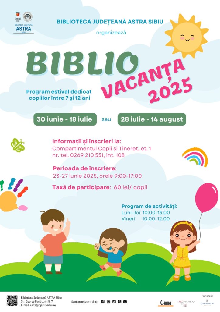 Biblioteca Județeană ASTRA Sibiu, cu sprijinul financiar al Consiliului Județean Sibiu, dă startul unei noi ediții a programului estival Bibliovacanța, dedicat copiilor cu vârste între 7 și 12 ani. Înscrierile pentru program se vor derula în perioada 23 – 27 iunie 2025, între orele 9:00 – 17:00, la Compartimentul pentru Copii și Tineret al bibliotecii.