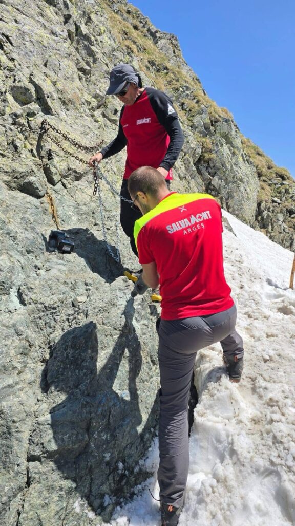 O echipă Salvamont Argeș a intervenit în această dimineață pe Vârful Moldoveanu, pe traseul din Malița, pentru a suplimenta lanțurile de siguranță din strunga situată între Viștea Mare și Moldoveanu.