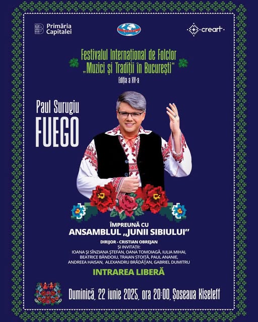Junii Sibiului merg la București cu un concert inedit alături de îndrăgitul artist Paul Surugiu (Fuego). Aceștia vor participa la cea de-a XV-a ediție a Festivalului Internațional de Folclor „Muzici și Tradiții în București”. Evenimentul, care va avea loc duminică, 22 iunie, de la ora 20:00, pe Șoseaua Kiseleff, promite o seară de excepție, cu intrare liberă pentru toți iubitorii folclorului românesc.