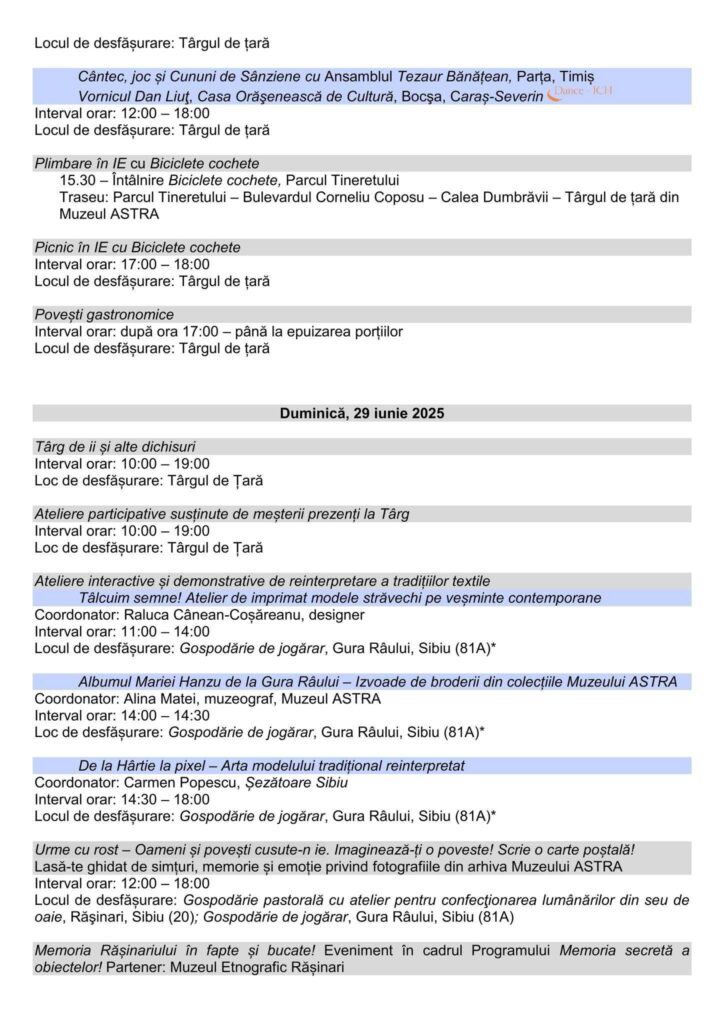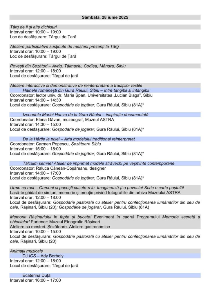În paralel, programul „Urme cu rost” și „Memoria Rășinariului în fapte și bucate!” vor continua în gospodăriile din Rășinari (20) și Gura Râului (81A), cu ateliere de gastronomie, meșteșuguri și șezători.