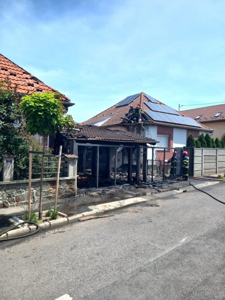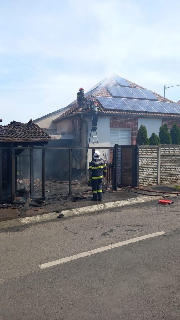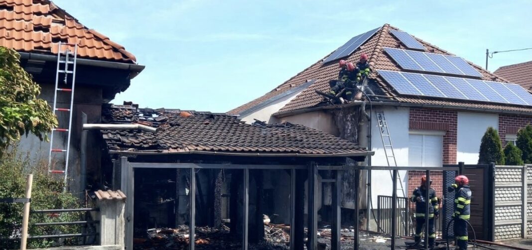 ACTUALIZARE : Incendiul a fost lichidat. Pompierii au reușit să salveze cele două case amenințate de flăcări. Incendiul s-a manifestat violent la terasa uneia dintre cele două case, aceasta fiind distrusă în totalitate (aproximativ 50 mp). Cele două case au fost ușor afectate la nivelul peretelui exterior și acoperiș (aproximativ 15 mp). Nu sunt înregistrate victime.