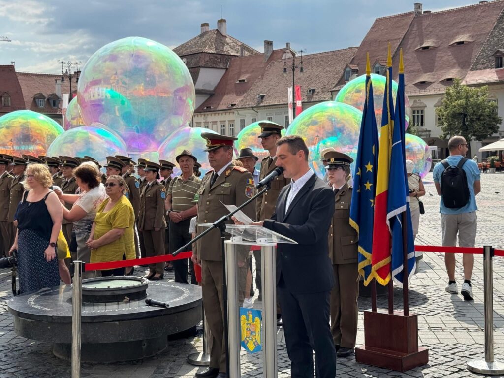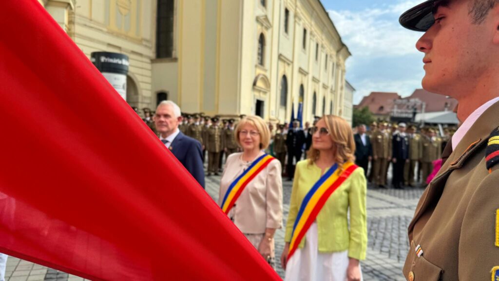 Drapelul României a fost arborat astăzi, 26 iunie, în mod festiv în Piața Mare din Sibiu, în cadrul unei ceremonii oficiale care a reunit autorități civile, militare și ecleziastice, precum și numeroși cetățeni.