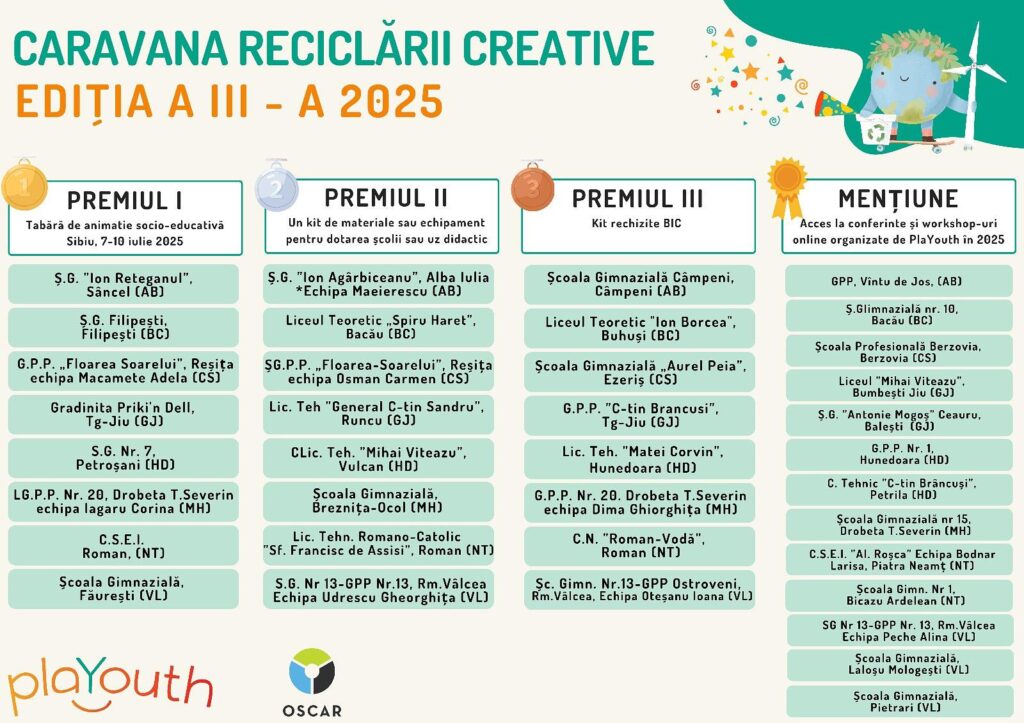 Școala Gimnazială „Regina Maria” a câștigat Premiul al III-lea și au câștigat ca premiu acces la conferințe și workhop-uri online organizate de PlaYouth în 2025.