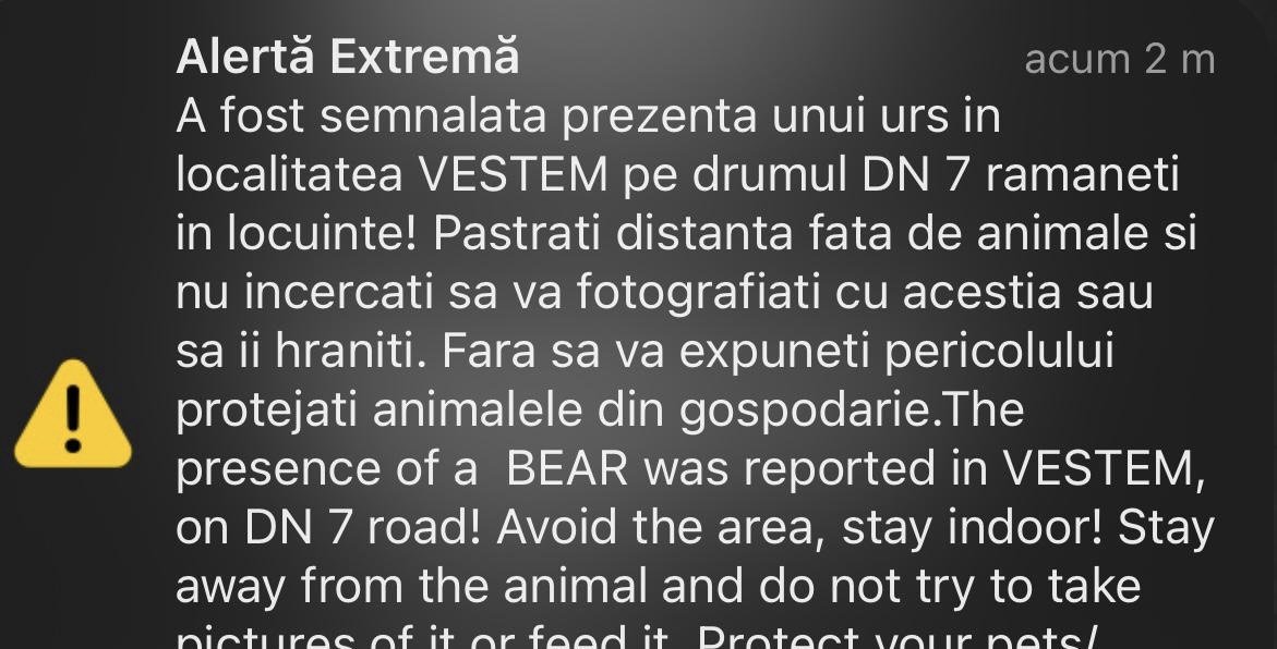 Urs semnalat pe DN 7, în zona localității Veștem. Autoritățile au emis mesaj RO-Alert