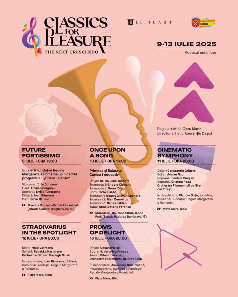 Orașul Sibiu devine, în perioada 9–13 iulie, gazda unei noi ediții a festivalului de muzică clasică „Classics for Pleasure”, desfășurat anul acesta sub tema „The Next Crescendo”, o celebrare a tinerilor artiști care dau contur viitorului muzicii clasice. Evenimentul este organizat de Asociația Elite Art Club UNESCO și este cofinanțat de Primăria Sibiu prin Agenda Culturală 2025.