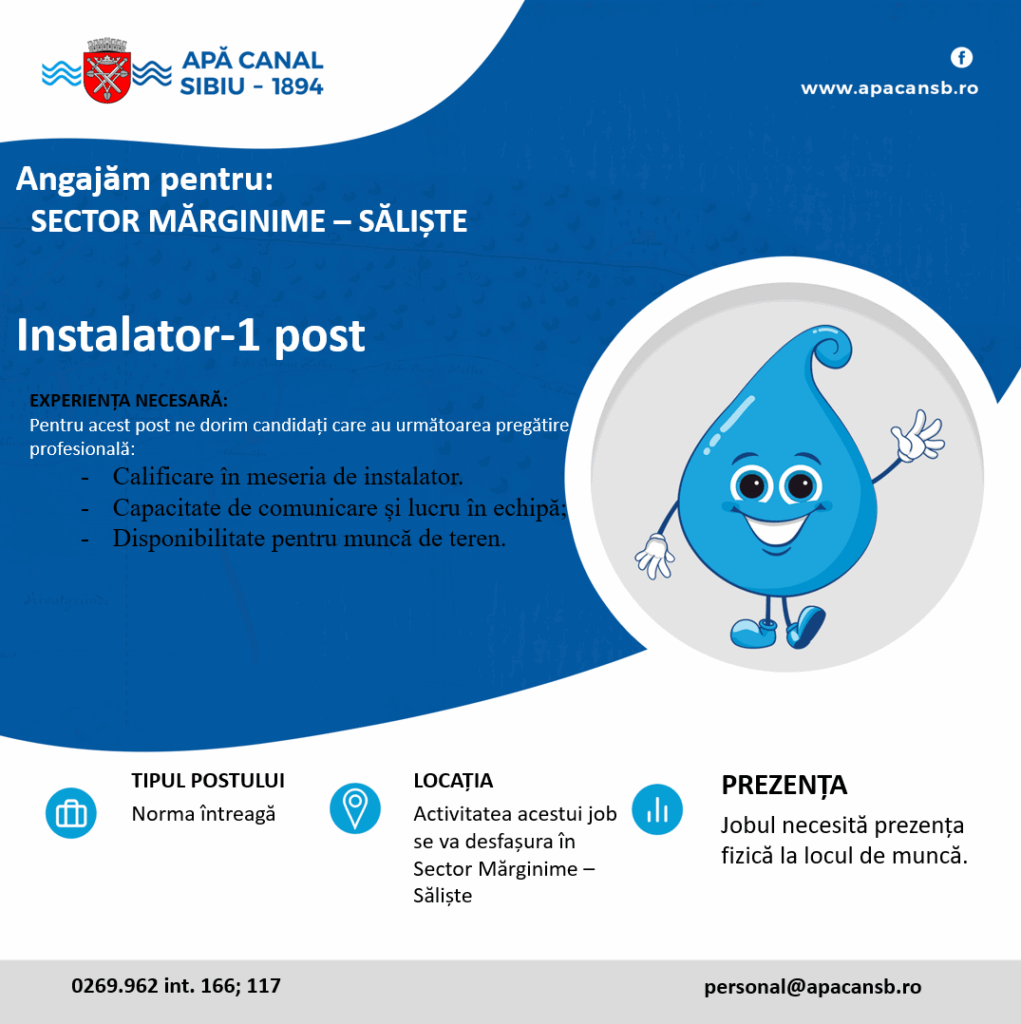 Apă Canal Sibiu S.A. recrutează un instalator pentru Sectorul Mărginime-Săliște.