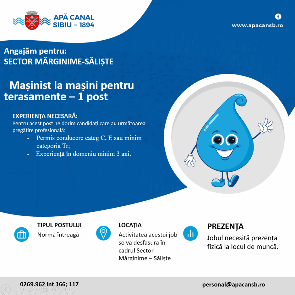Apă Canal Sibiu S.A. recrutează un Mașinist la mașini pentru terasamente pentru Sectorul Mărginime-Săliște.