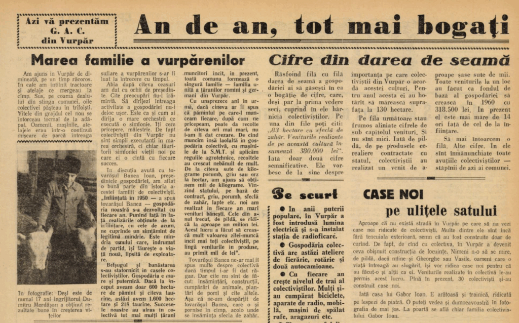 În primăvara anului 1961, redactorii Flacăra Sibiului pășeau în comuna Vurpăr pentru a documenta „viața nouă” a colectiviștilor. Reportajul de atunci surprindea o comunitate în plină transformare socialistă, cu gospodării colective în expansiune, grajduri noi, planuri îndrăznețe și un discurs propagandistic tipic epocii. Dar dincolo de ideologie, răzbate o energie reală, un entuziasm local și mândria unui sat în plină reconstrucție.