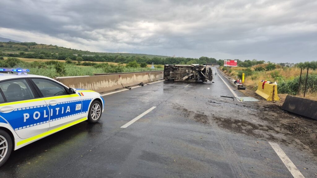 Din primele verificări efectuate la fața locului, polițiștii rutieri au stabilit faptul că, în timp ce conducea un microbuz de transport marfă pe DN 1, o femeie în vârstă de 27 de ani, din Roșia, pe fondul altor preocupari la volan, a pierdut controlul direcției de deplasare și s-a răsturnat pe carosabil.