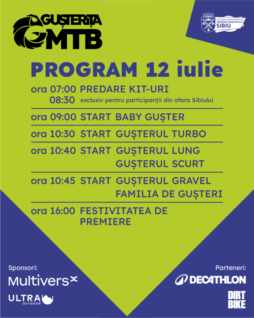 Organizat de Club Sportiv Grey Projects și cofinanțat de Primăria Municipiului Sibiu, evenimentul beneficiază de sprijinul sponsorilor MultiversX și Ultra Outdoor, precum și al partenerilor Decathlon, Urbana, CONA și Dirt Bike. Cu feedback pozitiv încă din faza de înscrieri, Gușterița MTB își propune să devină una dintre cele mai fresh și bine organizate competiții de profil din România.