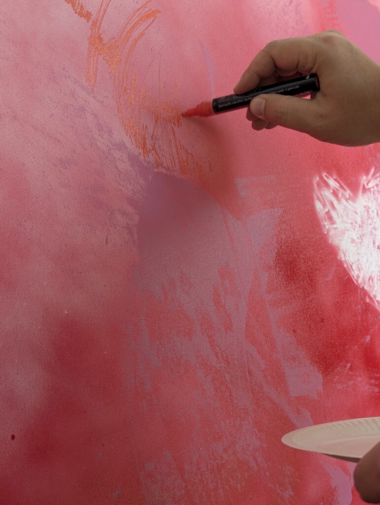 „Am aflat că pânza expusă în Piața Mică e deschisă intervențiilor, așa că le-am propus cursanților mei de la Școala Populară de Arte și Meserii Ilie Micu să venim cu o contribuție colectivă. Așa, să spargem gheața și să îi îndemnăm și pe alții să se prindă în acest joc artistic. Ne-am luat culorile și pensulele și am înfruntat soarele după-amiezii. A fost o experiență spontană, un amestec de tușe abstracte, doodle-uri, transparențe și un portret din profil care poate deveni un punct de plecare pentru cei care vor urma. Sunt curios de cum va arăta la final!.”- a spus Cătălin Precup, unul dintre artiștii care au intervenit pe pictura colaborativă.