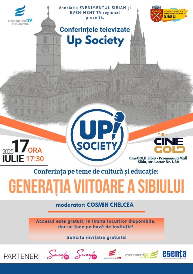 Asociația Evenimentul Sibian și Eveniment TV Regional anunță lansarea seriei de conferințe televizate „UP Society”, cu prima ediție intitulată „Generația viitoare a Sibiului”, ce va avea loc miercuri, 17 iulie, începând cu ora 17:30, la CineGOLD din Promenada Mall. Proiectul este cofinanțat de Primăria Municipiului Sibiu și își propune să aducă în prim-plan tineri implicați civic, alături de profesioniști din educație, cultură și societate civilă.