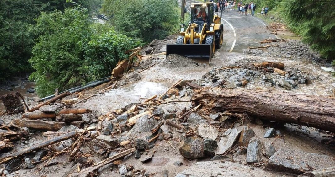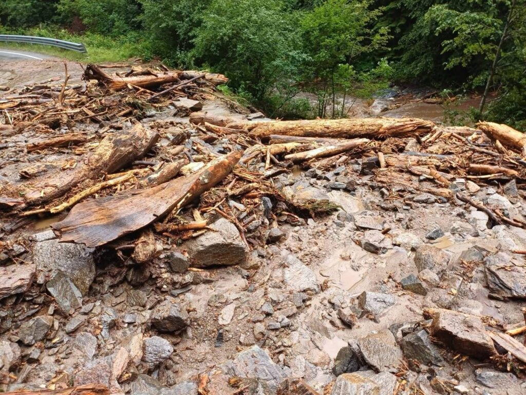 Ploaia torențială a provocat viituri puternice, care a adus pe carosabil bucăți de copaci, stânci și pietre. Un autoturism a rămas blocat în zonă, însă, din fericire, nicio persoană nu a fost rănită.