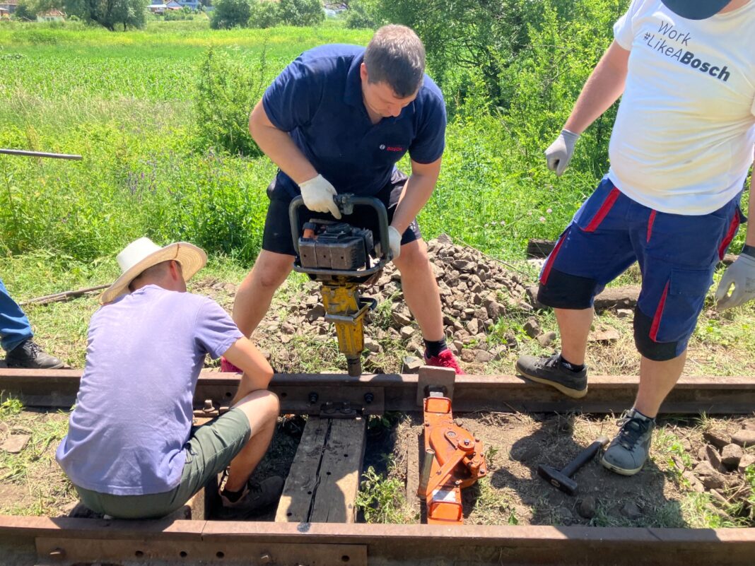 Asociația Prietenii Mocăniței împreună cu 17 voluntari de la Compania Bosch Sibiu au contribuit la reconstrucția mocăniței hârtibăcene, în cadrul unui team building inedit, desfășurat nu într-o sală de conferințe, ci chiar pe teren, acolo unde este cel mai mult nevoie de ajutor: la linie.