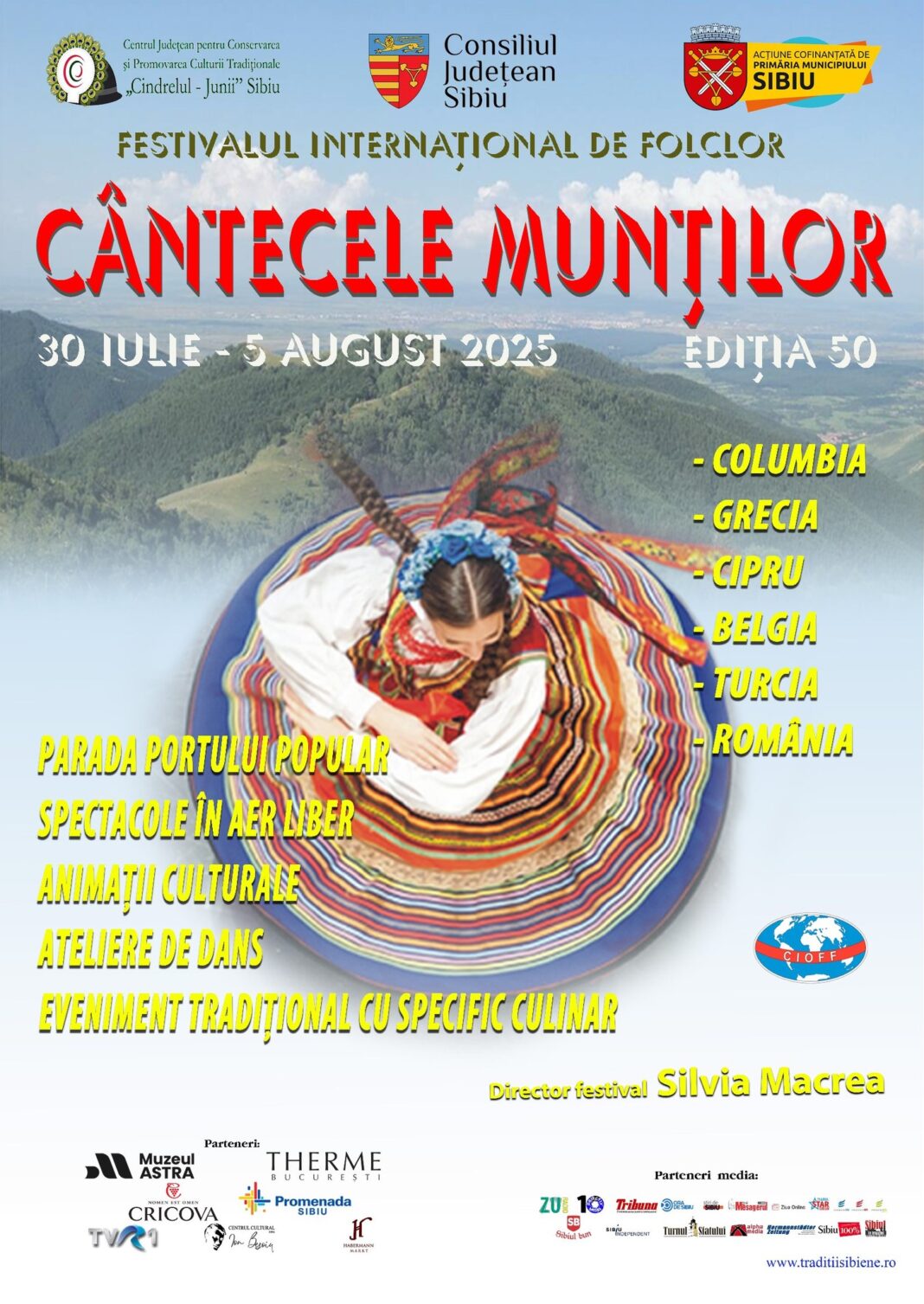 Festivalul Internațional de Folclor „Cântecele Munților” marchează anul acesta 50 de ani de la prima desfășurare, printr-o săptămână întreagă dedicată culturii, dansului și portului popular din întreaga lume. În perioada 30 iulie – 5 august, festivalul va anima Piața Mare din Sibiu și alte locații din oraș cu o serie de evenimente inedite și interactive. Evenimentul este organizat de CJCPCT „Cindrelul–Junii Sibiu”, cu sprijinul Primăriei Municipiului Sibiu și finanțarea Consiliului Județean Sibiu.