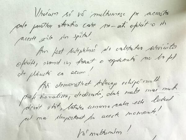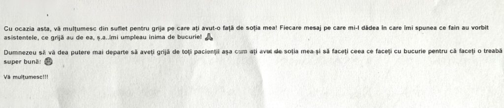 Vă mulțumesc din suflet pentru grija pe care ați avut-o față de soția mea! Fiecare mesaj pe care mi-l dădea în care îmi spunea ce fain au vorbit asistentele, ce grijă au de ea ș.a. … îmi umpleau inima de bucurie! Dumnezeu să vă dea putere mai departe să aveți grijă de toți pacienții așa cum ați avut de soția mea și să faceți ceea ce faceți cu bucurie, pentru că faceți o treabă super bună!