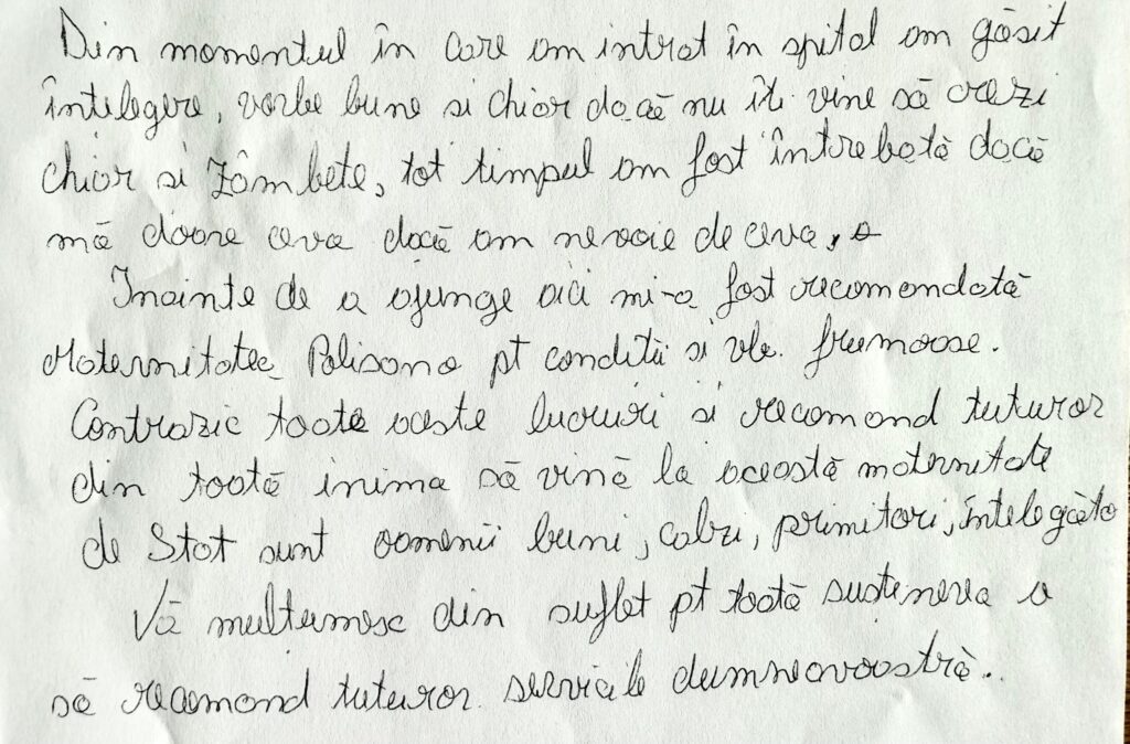 Personalul medical de la Maternitatea Spitalului Clinic Județean de Urgență Sibiu, au primit mesaje scrise de mulțumire din partea pacientelor și soților acestora. În scrisori, pacientele lăudau și mulțumeau asistentelor pentru grija și vorbele frumoase oferite.