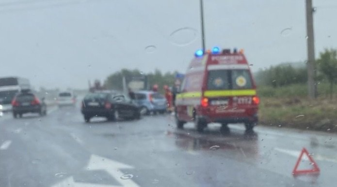 Traficul rutier este blocat pe bandă, pe DN 1, în zona Veștem. Aici, trei mașini au intrat într-o coliziune violentă.