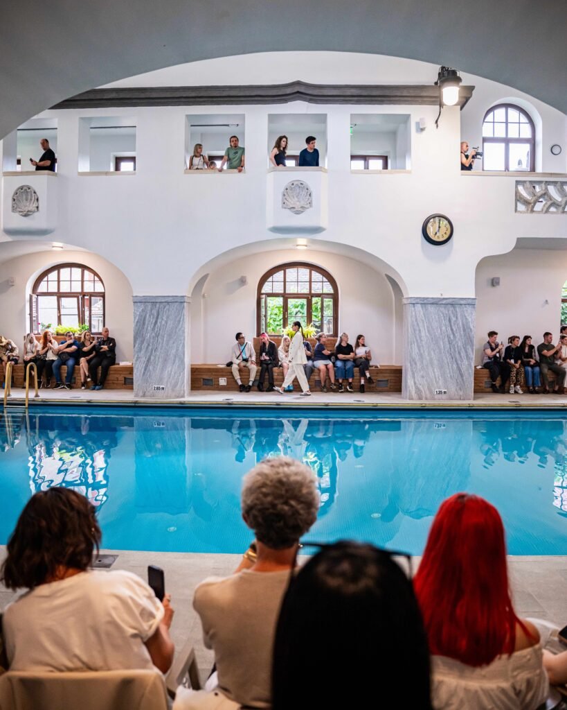 În jurul bazinului de la Baia Populară, designerul Viktor Spasov a adus pe catwalk colecția „NOCTERA” pentru brandul VERÈDIA, un „power dressing” ce îmbină autoritate și delicatețe prin catifea neagră și organza fluidă.