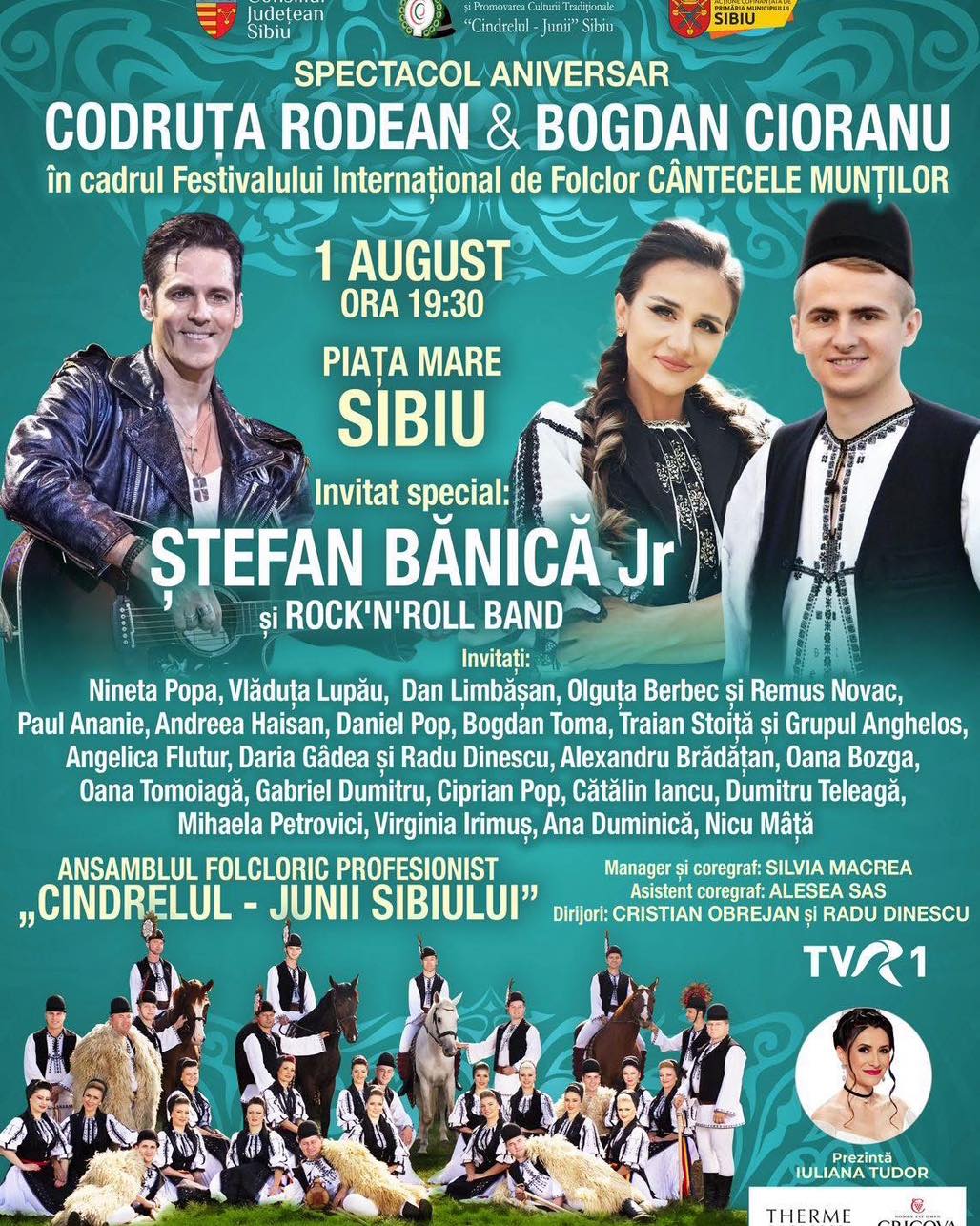 Piața Mare din Sibiu va găzdui vineri, 1 august un eveniment de excepție în cadrul ediției cu numărul 50 a Festivalului Internațional de Folclor „Cântecele Munților”. Codruța Rodean și Bogdan Cioranu vor urca pe scenă alături de ansamblul Junii Sibiului, într-un spectacol ce îmbină tradiția cântecului și jocului popular românesc cu influențe moderne. Invitatul special al serii va fi Ștefan Bănică Jr., care va aduce un plus de energie și va completa armonios spectacolul Junilor Sibiului și al artiștilor invitați.