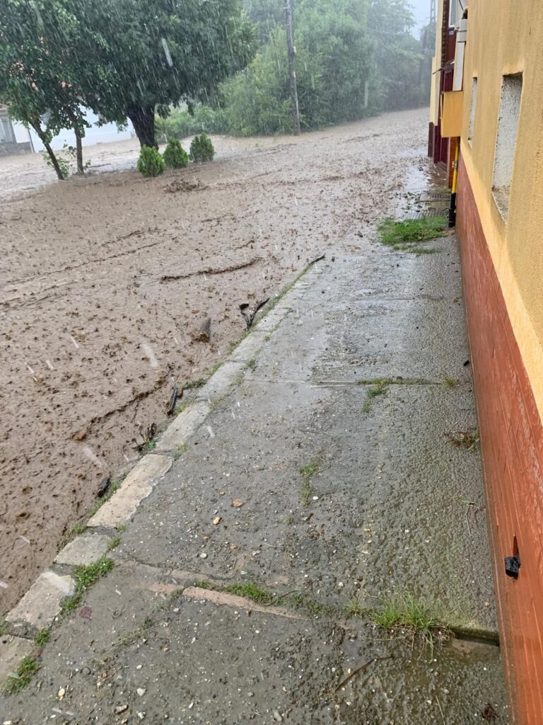 În Cisnădie, pe strada Lungă, un pârâu a ieșit din matcă, afectând o casă.