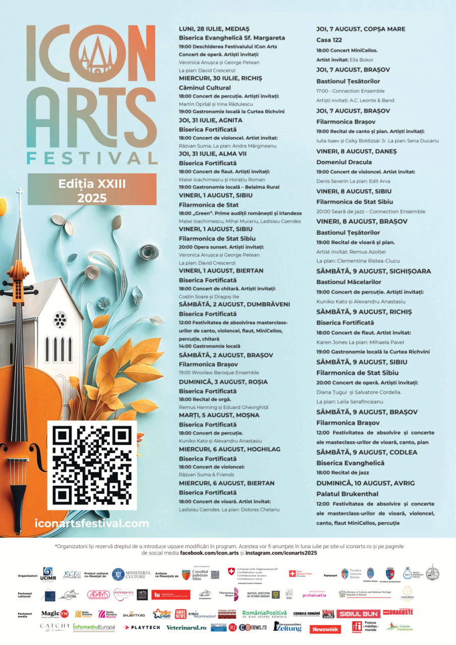 Uniunea de Creație Interpretativă a Muzicienilor din România anunță deschiderea celei de-a XXIII-a ediții a Festivalului ICon Arts Transilvania, unul dintre cele mai longevive evenimente internaționale dedicate muzicii clasice, jazz și artelor contemporane. Tema de anul acesta este „Slow Life. Slow Food. Slow Music.” Organizatorii invită publicul la o incursiune în ritmul tihnit al satelor transilvănene, unde muzica și cultura se împletesc cu tradițiile locale și descoperirea de sine.