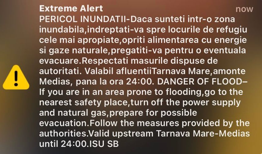 În acest sens a fost transmis mesaj de avertizare RO-Alert pe raza localităților Mediaș, Alma, Ațel, Blăjel, Dumbrăveni, Hoghilag, Laslea, Brateiu, Bazna, Dârlos, Biertan, Târnava.