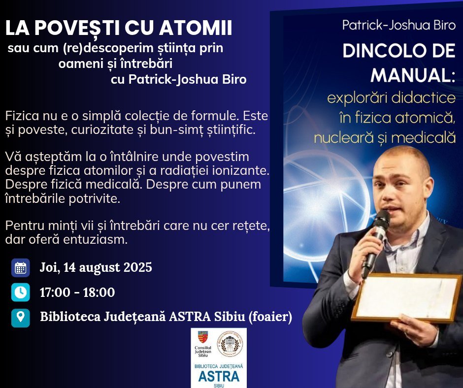 Biblioteca ASTRA va găzdui în data de 14 august în intervalul 17:00 – 18:00, o întâlnire inedită cu Patrick-Joshua Biro, autorul volumului „Dincolo de manual: explorări didactice în fizica atomică, nucleară și medicală”. Evenimentul poartă titlul „La povești cu atomii sau cum (re)descoperim știința prin oameni și întrebări” și promite o incursiune captivantă în lumea fizicii, adresată tuturor celor curioși, indiferent de vârstă.