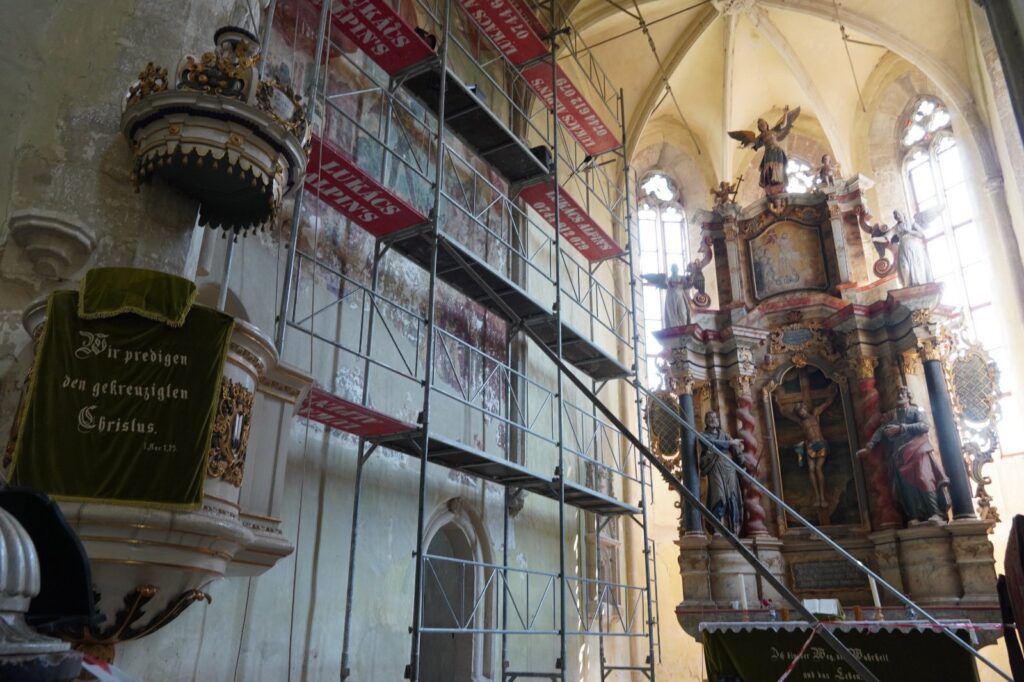 Așa se face că pe exteriorul bisericii a fost depus un strat gros de var, care a fost dezvelit în 1957 de către enoriașii sași. O vară întreagă oamenii au muncit din greu, dar cu folos: de sub stratul de var au apărut mici bijuterii arhitecturale sculptate în piatră.