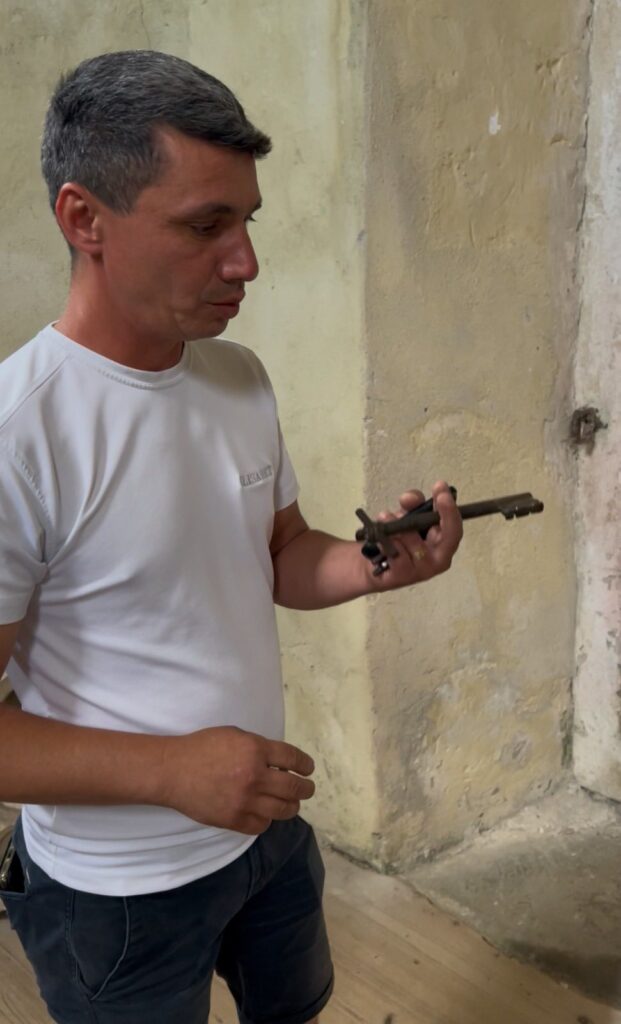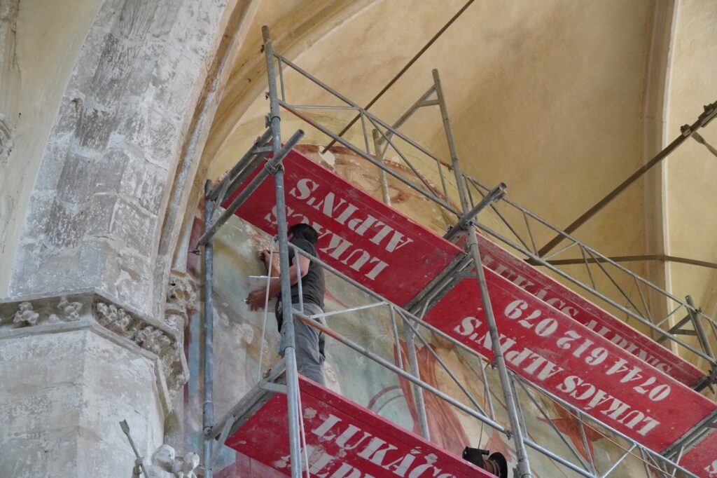 Martor involuntar la acest experiment este unul dintre specialiștii restauratori angajați pentru refacerea picturii murale. Din înaltul schelei, ascultă explicațiile ghidului: „Așa ceva nu am văzut la nicio biserică în care am lucrat. Și n-au fost puține”, spune restauratorul Lorand Kiss în timp ce trage o line fină cu pensula.