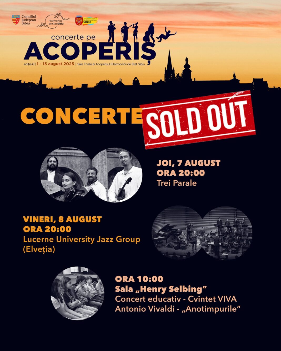 Festivalul „Concerte pe Acoperiș”, ediția a VI-a, continuă în forță săptămâna aceasta, cu trei evenimente muzicale ce se vor desfășura cu casa închisă. Publicul a răspuns cu entuziasm, iar biletele pentru toate concertele programate în următoarele zile au fost deja epuizate.