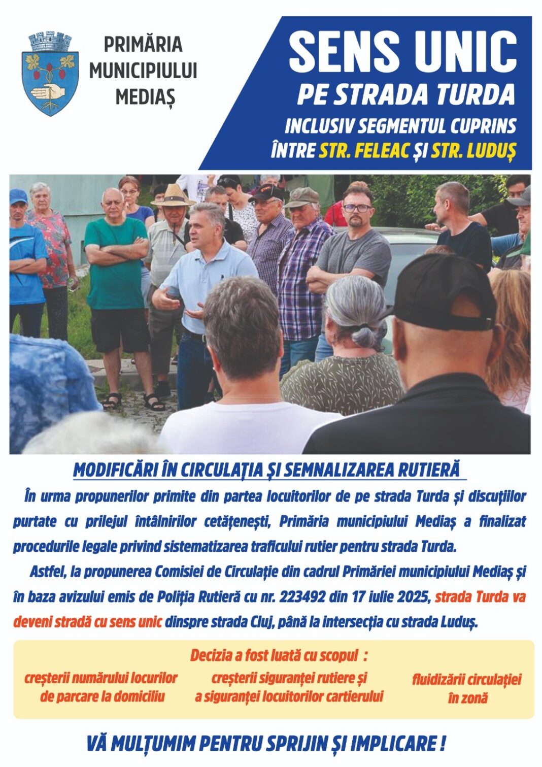 Primăria Municipiului Mediaș a anunțat instituirea unui sens unic de circulație pe strada Turda, în urma solicitărilor primite din partea locuitorilor, în cadrul întâlnirilor cu primarul Gheorghe Roman. Astfel, strada Turda va deveni stradă cu sens unic dinspre strada Cluj până la intersecția cu strada Luduș.