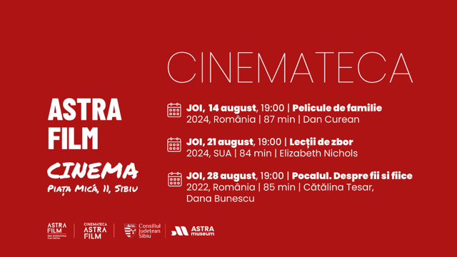 Cinemateca de vară, organizată de Astra Film și CNM Astra cu sprijinul Consiliului Județean Sibiu, va avea loc în fiecare joi din luna august, la ora 19:00, în aceeași locație.