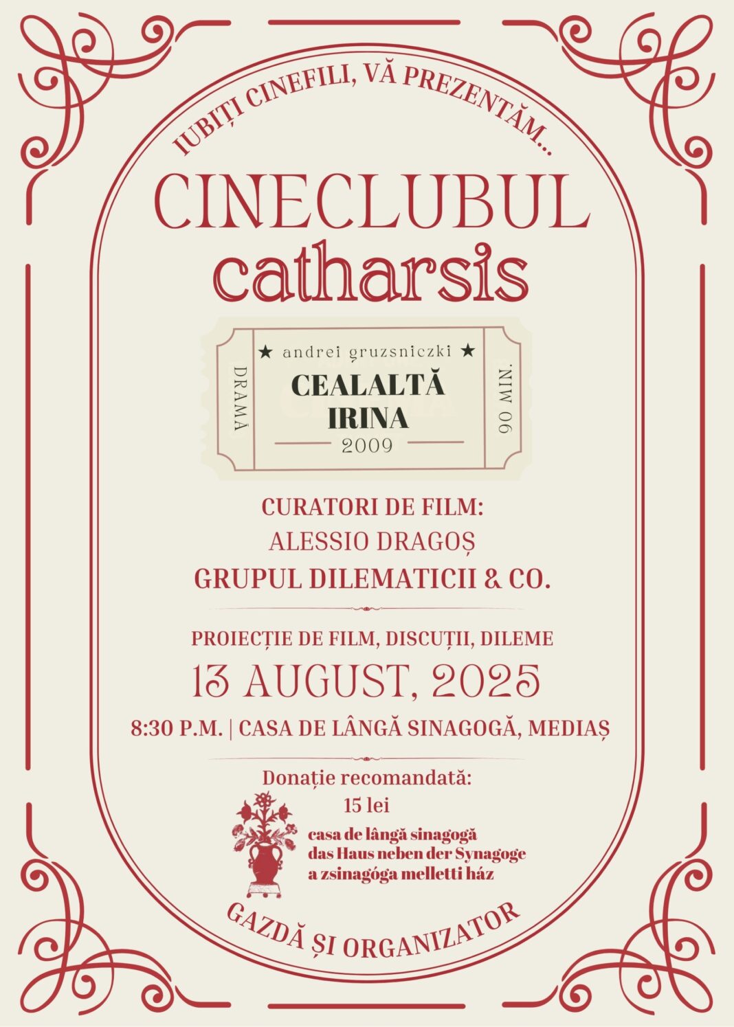 Grădina sinagogii din Mediaș va găzdui miercuri, 13 august de la ora 20:30, lansarea oficială a Cineclubului Catharsis, un nou proiect cultural dedicat pasionaților de cinema. Evenimentul marchează apariția unui spațiu-refugiu pentru vizionări de film și dialoguri pe marginea acestora, cu scopul de a construi o comunitate activă de cinefili și cineaști.