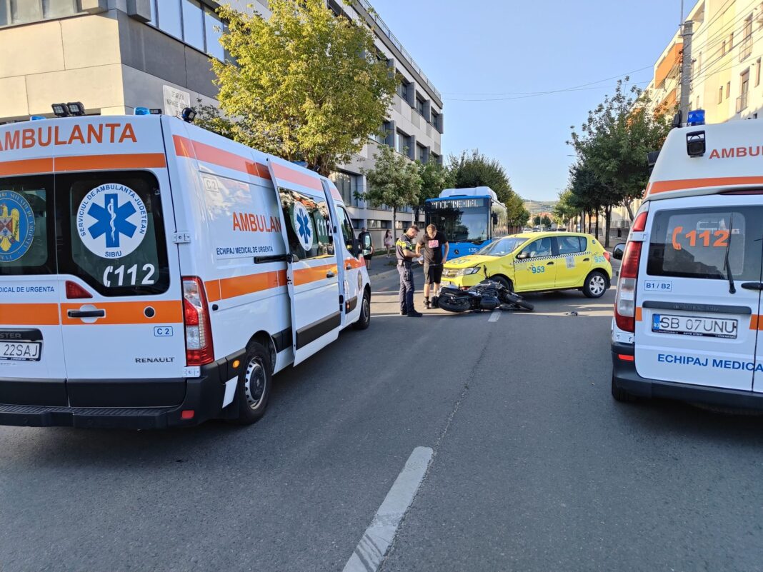 Polițiștii rutieri au intervenit sâmbătă pe Calea Gușteriței din municipiul Sibiu, în urma unui accident rutier produs între un autoturism și o motocicletă.