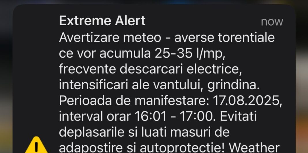 Locuitorii municipiului Sibiu au primit în această după-amiază, duminică, 17 august 2025, o notificare de tip RO-ALERT, transmisă de ISU Sibiu, prin care sunt avertizați cu privire la fenomene meteo periculoase. Avertizarea s-a transmis și locuitorilor din Șelimbăr, Slimnic și Șura Mare.