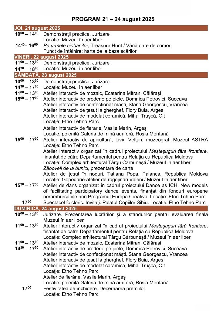 Potrivit Elenei Găvan muzeogral al muzeului, meșteșugurile prezentate în cadrul olimpiadei acoperă o gamă largă de tehnici tradiționale, de la olărit, pictură pe sticlă și pe lemn, încondeiat ouă, sculptură și mobilier pictat, până la confecționarea de păpuși, opinci, pălării, podoabe sau țesături. Publicul are ocazia să participe la ateliere demonstrative gratuite, organizate sâmbătă și duminică, unde meșterii vor oferi lecții de fierărie, mozaic, țesut la gherghef, broderie pe piele sau modelaj ceramic. Programul este completat de momente folclorice și expoziții.