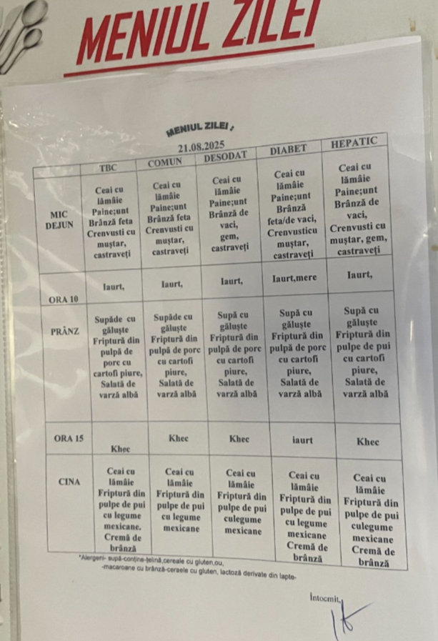 Micul dejun a fost simplu, dar hrănitor: ceai cu lămâie, pâine cu unt și brânză feta sau de vaci, alături de crenvuști cu muștar și castraveți, în funcție de regim. Pentru pacienții cu dietă desodată sau hepatică, meniul a inclus și gem, pentru un plus de energie.