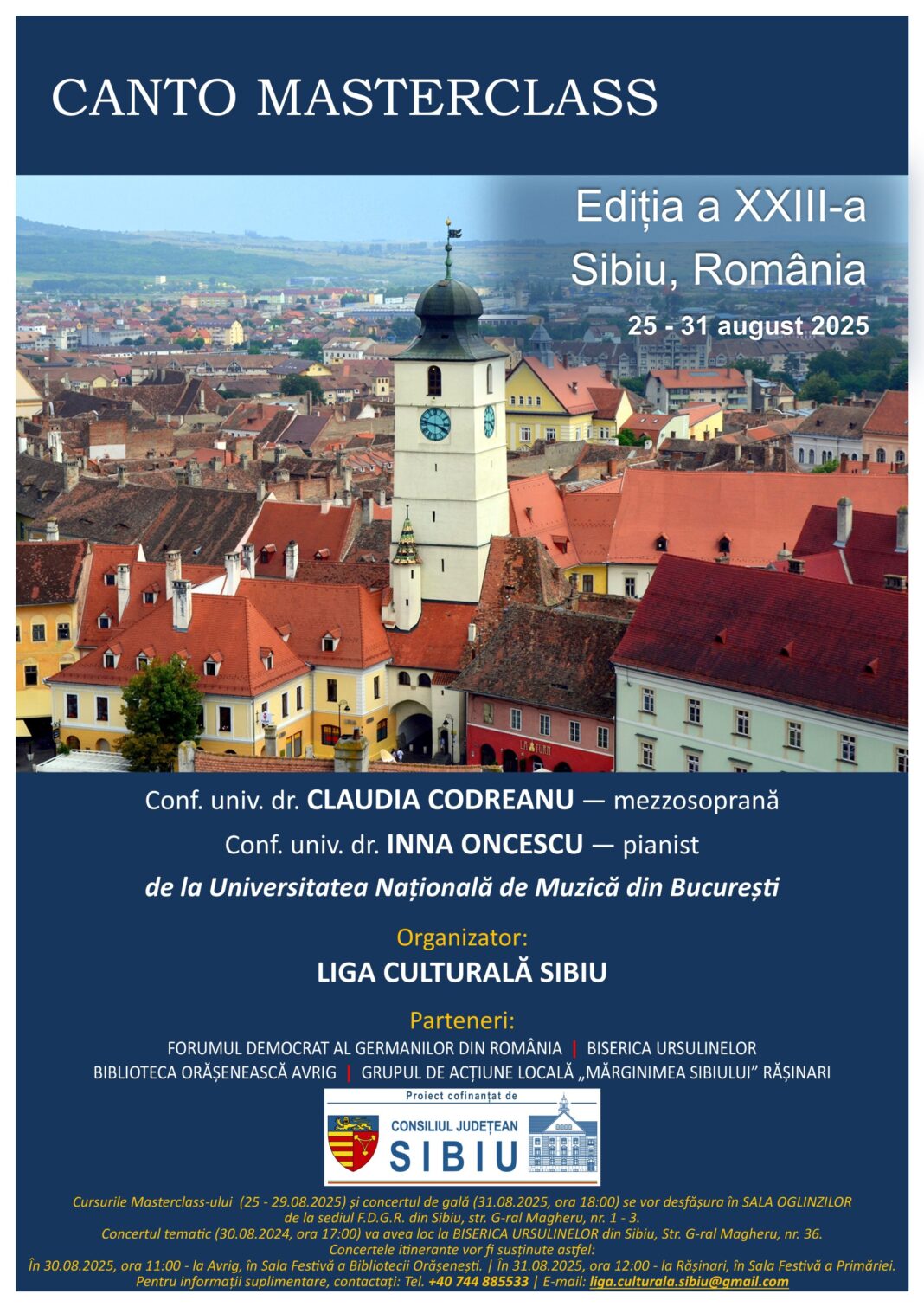 La finalul lunii august, cea de-a 23-a ediție a Masterclass-ului de canto clasic „Spre o Academie de Muzică la Sibiu”, aduce în oraș două evenimente muzicale importante organizate de Liga Culturală Sibiu.