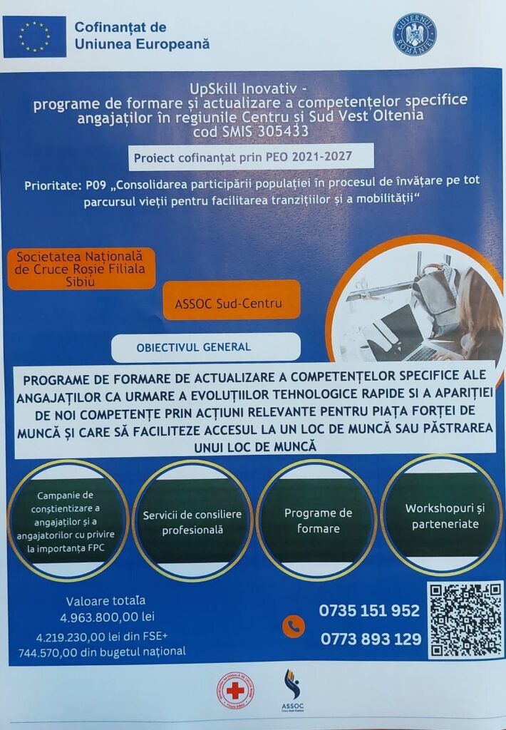 Cursul este organizat în cadrul proiectului „UpSkill Inovativ- programe de formare și actualizare a competențelor specifice angajaților în regiunile Centru și Sud-Vest Oltenia”, derulat între 1 septembrie 2024 și 31 august 2027.
