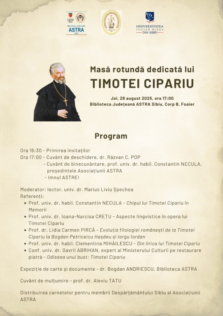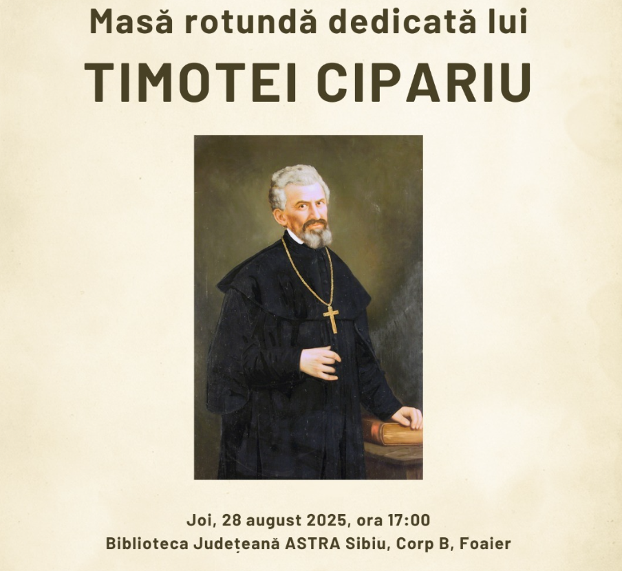 Biblioteca Astra găzduiește mâine de la ora 17:00 o masă rotundă dedicată lui Timotei Cipariu, figură emblematică a culturii române, considerat „părintele filologiei române„. Evenimentul va avea loc în Foaierul bibliotecii, Corp B.